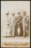 cca 1900-1910 Divatos öltözetű hölgyek és urak csoportképe, keményhátú kabinetfotó, dekoratív hátlappal, 16,5x10,5 cm